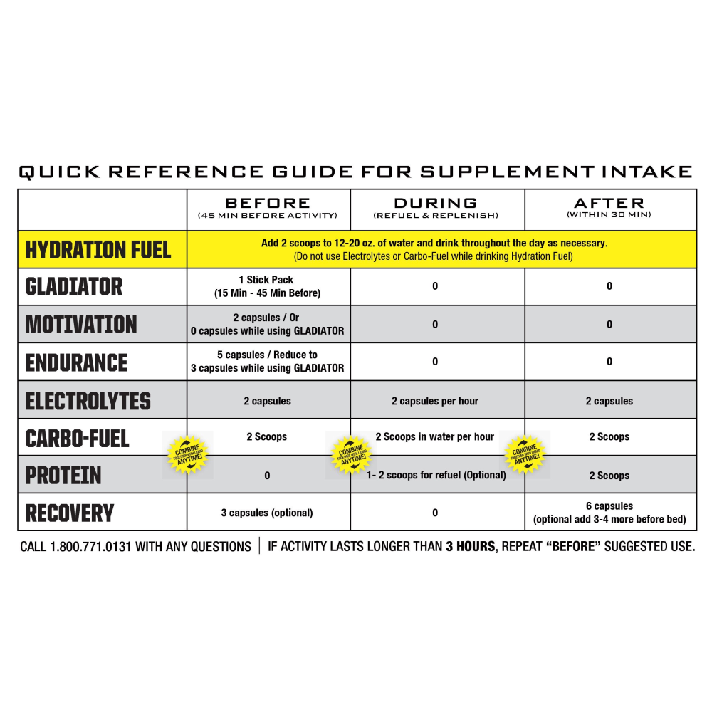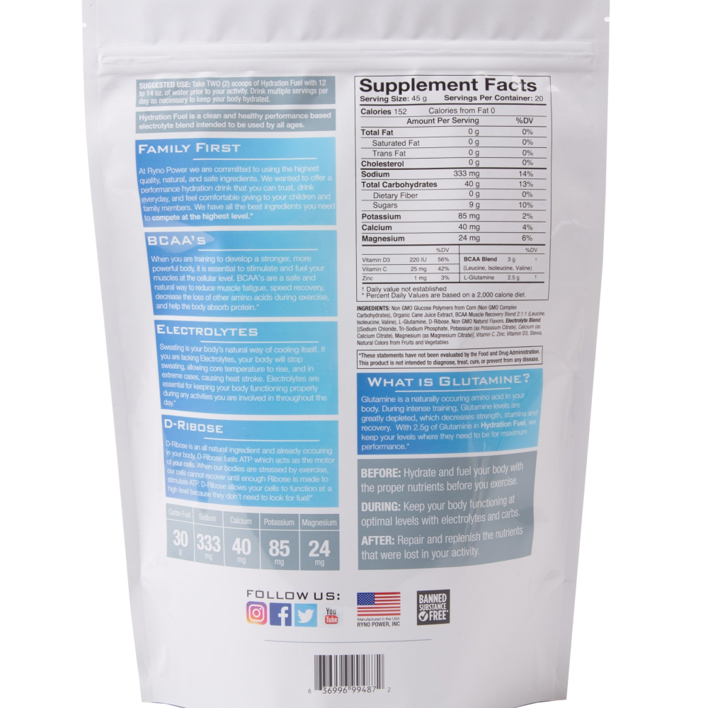 • CONTAINS CARBO-FUEL - Hydration Fuel is mixed with our own Carbo-Fuel to provide a blend that immediately boosts and sustains your body's energy. It is packed with 30 grams of Non-GMO Carbohydrates that let you push yourself to better results.