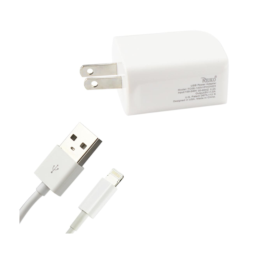 REIKO IPHONE SE/ 5S/ 5 1 AMP PORTABLE WALL USB TRAVEL ADAPTER CHARGER WITH CABLE IN WHITE